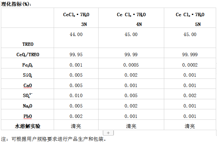 氯化鈰外觀性狀:無色或淡黃色結晶體,易溶於水和乙醇,有潮解性,密閉保存。
