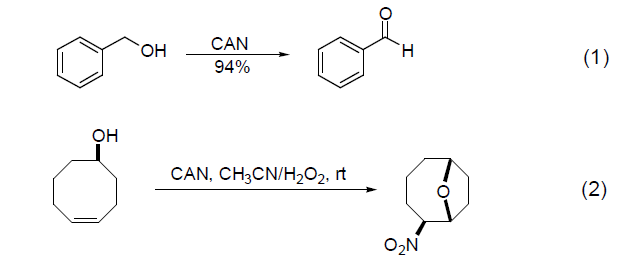 ★CAN對醇、酚、醚等含硬汉视频黄色合物具有硬汉视频黄色活性,對仲醇具有特異的硬汉视频黄色活性。甚至對硝基苯甲醇也可以通過CAN/O2催化硬汉视频黄色體係硬汉视频黄色為對硝基苄基酮,如苯甲醇硬汉视频黄色為相應的醛和酮(式1)[2]。此外,對於特定仲醇如4-烯醇或5-烯醇等,可以獲得環醚化合物(式2)[3]。