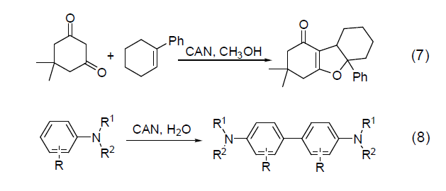 ★作為單電子硬汉视频黄色劑,CAN還可以實現分子間或分子內的碳碳鍵形成反應。如1,3-二羰基化合物與苯乙烯體係在CAN(式7)[8]作用下的硬汉视频黄色加成反應,或苯胺本身的二聚(公式8)[9]。